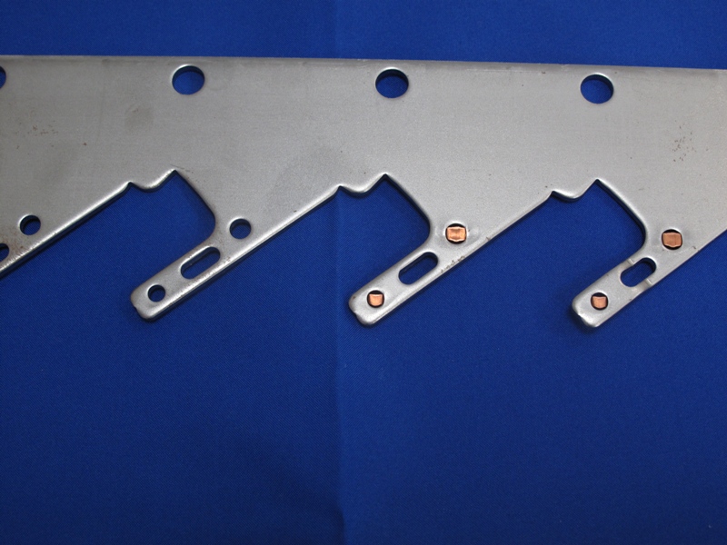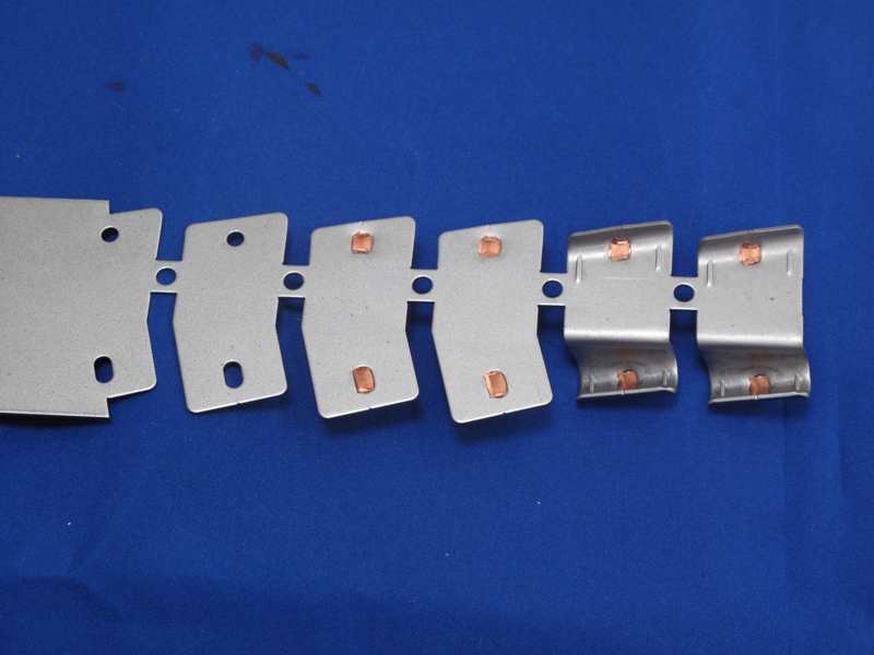 SPCC材などに銅材をかしめて製品にする順送プレス。ブレージング向け製品などに。